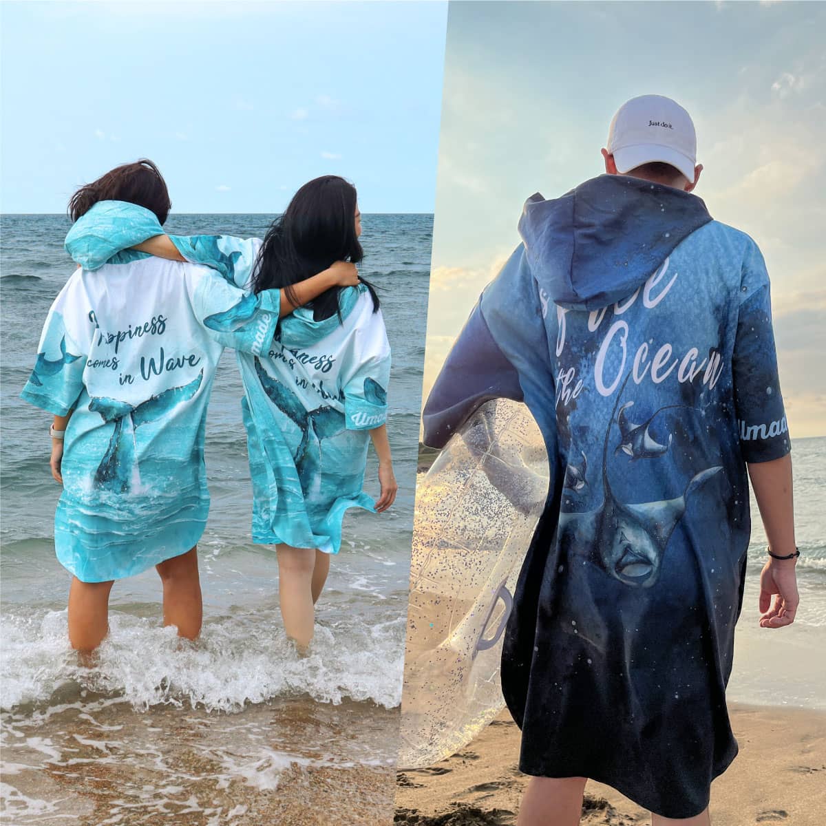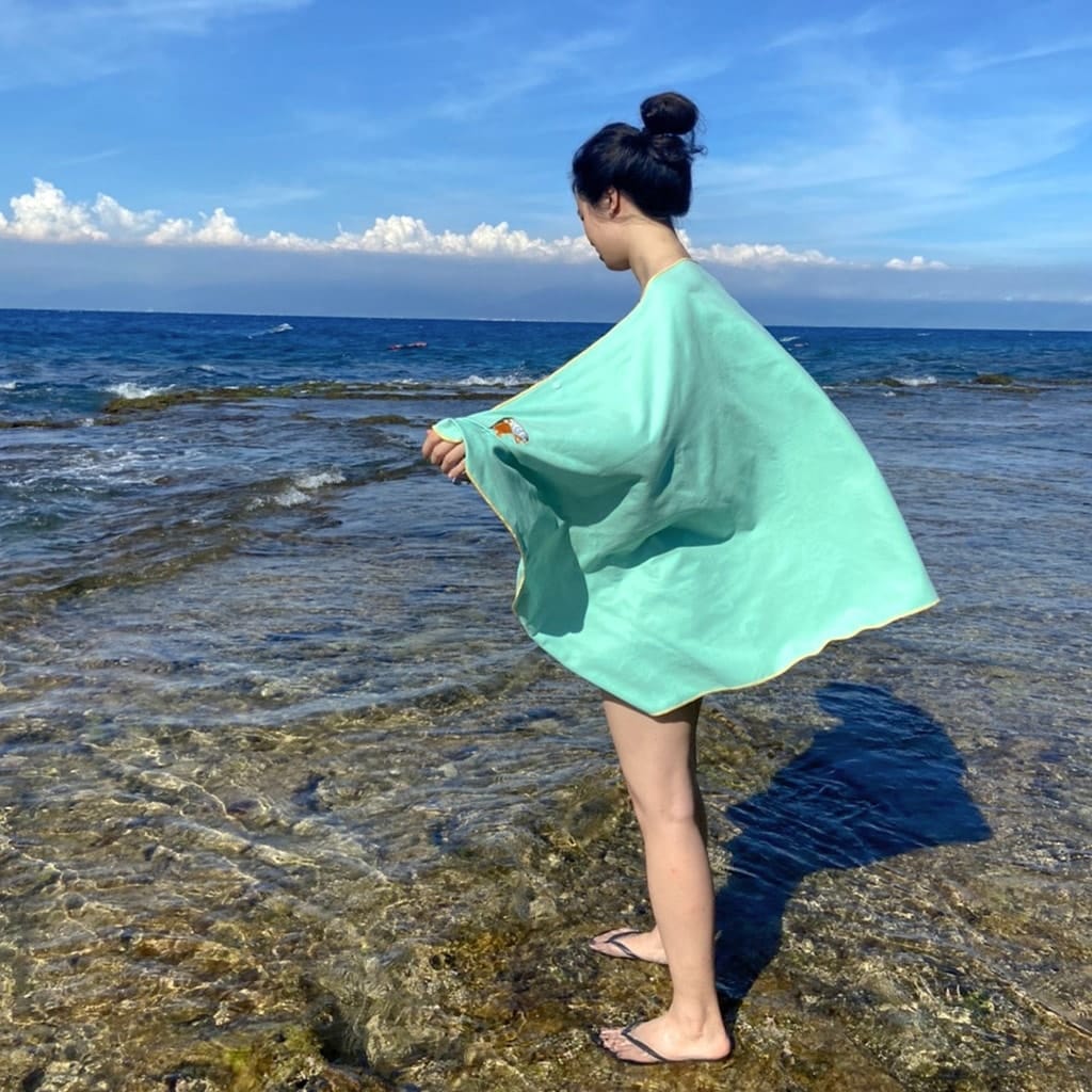 真的吸水超快超強又易乾 ! 折起來輕薄好攜帶,鬼蝠魟圖案搭配深海藍批在身上超靚,浮潛起來批身上還能禦寒防曬,是推薦好物。