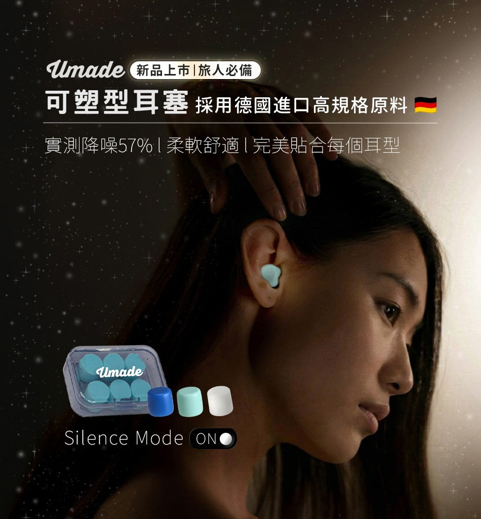 Umade可塑型耳塞,採用德國進口高規格原料,實測有效降噪57%,柔軟舒適完美貼合每個耳型,可選三種顏色:普魯士藍、蒂芬尼藍、清透淨白,含耳塞收納盒。