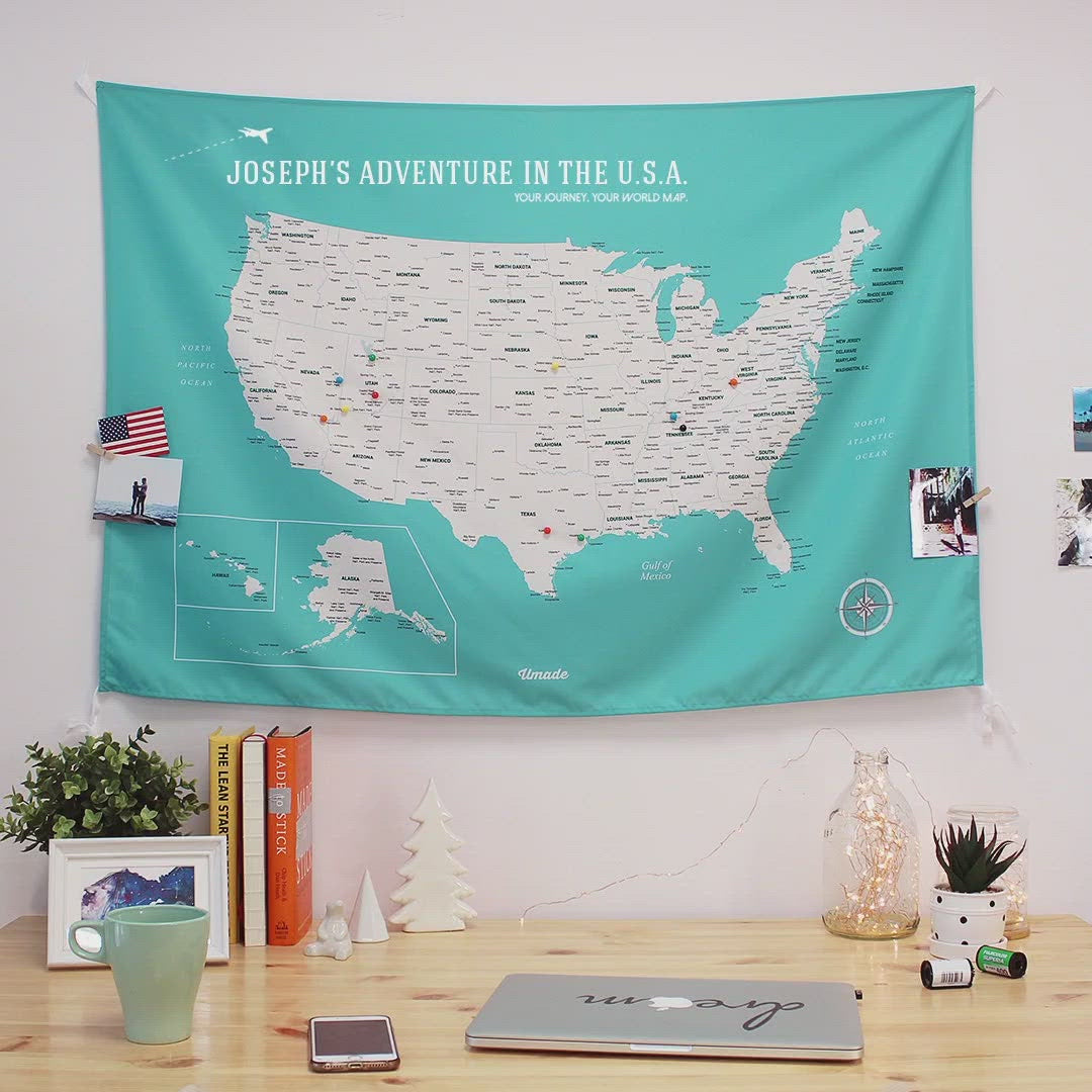 “Your Journey, Your U.S.A. Map.” 訂製你的名字或任何句子,開始記錄專屬“你的”美國足跡吧! 一分鐘輕鬆掛 日本引進熱昇華轉印技術 UMap專用磁鐵地標扣是特別為你的訂製地圖所設計的地標標示,採用強力磁鐵與特殊鑲嵌設計,不需另外準備鐵板或磁鐵板,使用附上的後扣就可以牢牢固定在地圖上喔!