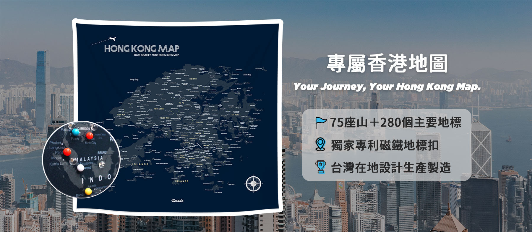 HONG KONG MAP MY HONG KONG MAP OUR HONG KONG MAP MY HOME KONG MAP 還有見證歷史的大樓/地點 一分鐘輕鬆掛 日本引進熱昇華轉印技術 UMap專用磁鐵地標扣是特別為你的訂製地圖所設計的地標標示,採用強力磁鐵與特殊鑲嵌設計,不需另外準備鐵板或磁鐵板,使用附上的後扣就可以牢牢固定在地圖上喔!訂製訊息4選1